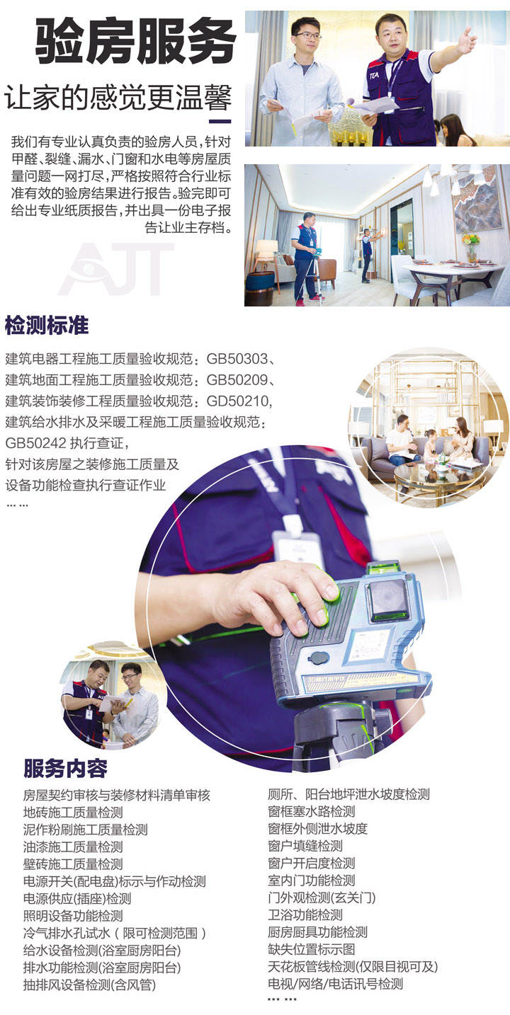Floor plan review, entrance door construction quality inspection, window construction quality inspection, window functional inspection, wall surface construction quality inspection, cylindrical surface construction quality inspection, ground construction quality inspection, sky surface construction quality inspection, beam surface Engineering construction quality inspection, balcony railing, window guardrail construction quality inspection, water supply and drainage function inspection, waterproof engineering inspection, yin and yang right angle inspection, strength and weakness distribution box and switch socket, exhaust system inspection, flue system inspection